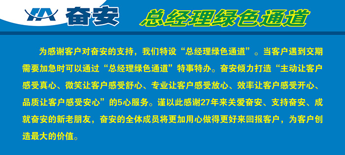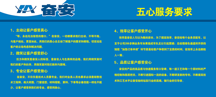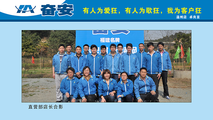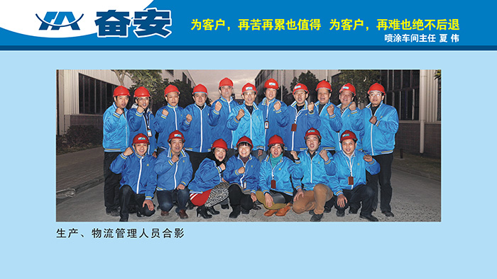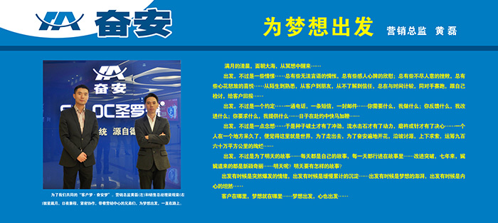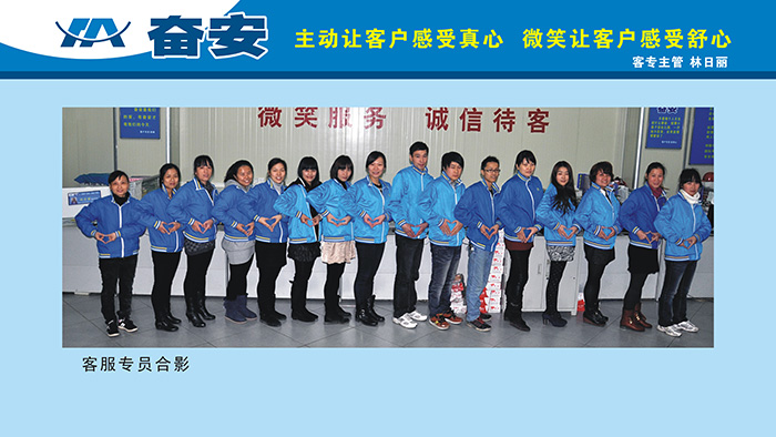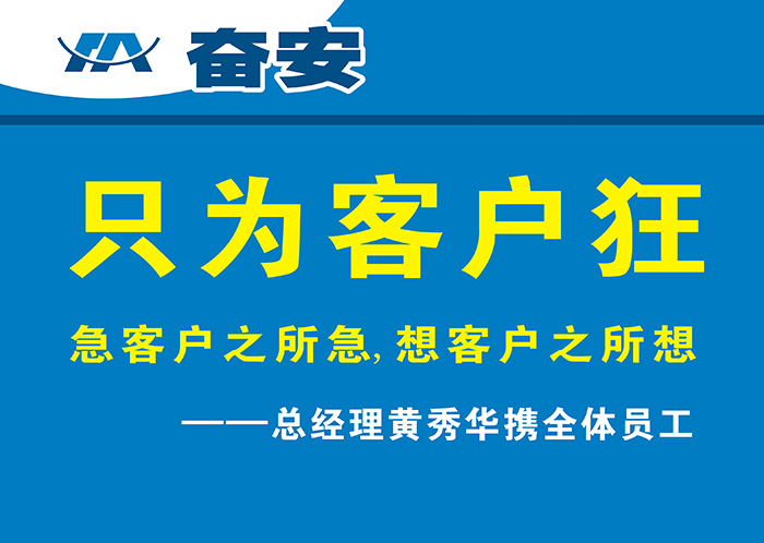 一部由奮安集團(tuán)市場(chǎng)中心主辦的,匯集奮安集團(tuán)銷售、生產(chǎn)、后勤、物流各職能部門(mén)職員,在奮安1號(hào)客服——集團(tuán)總經(jīng)理黃秀華女士的帶領(lǐng)下,秉承“只為客戶狂——盡一切努力,只為客戶滿意”的服務(wù)理念,在日常工作中所表現(xiàn)出來(lái)的各種狂人狂事的著作《只為客戶狂》,于2014年2月11日正式出版。 奮安人全員皆客服,全體奮安人只為客戶而瘋狂,做客戶真誠(chéng)的朋友和伙伴。為感謝廣大客戶對(duì)奮安的支持與鼓勵(lì),奮安全體成員將更加用心做得更好來(lái)回報(bào)客戶,我們將嚴(yán)格按照“品質(zhì)高、交期準(zhǔn)、服務(wù)好”的標(biāo)準(zhǔn)來(lái)為客戶創(chuàng)造最大的價(jià)值。這就是我們只為客戶而瘋狂的奮安人。