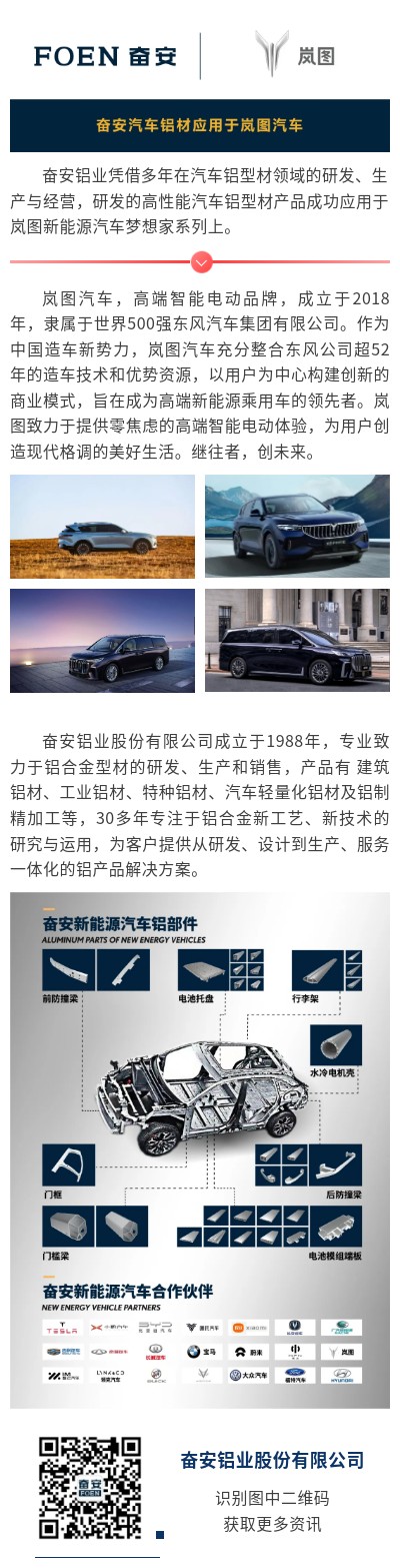 【產(chǎn)品應(yīng)用案例】奮安汽車鋁部件應(yīng)用于嵐圖新能源汽車