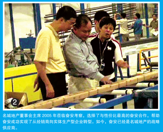 (名城地產(chǎn)董事會主席2005年蒞臨奮安考察,選擇了與性價比最高的奮安合作,幫助奮安成功實現(xiàn)了從經(jīng)銷商向?qū)嶓w生產(chǎn)型企業(yè)轉(zhuǎn)型。如今,奮安已是名城地產(chǎn)的戰(zhàn)略供應(yīng)商。)