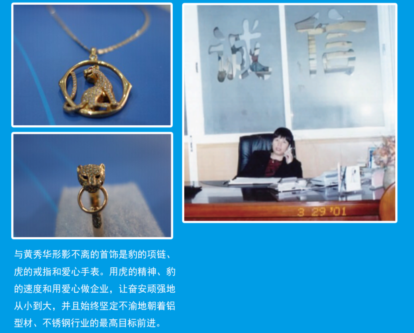 (與黃秀華形影不離的首飾是豹的項鏈、虎的戒指和愛心手表。用虎的精神、豹的速度和用愛心做企業(yè),讓奮安頑強地從小到大,并且始終堅定不渝地朝著鋁型材、不銹鋼行業(yè)的最高目標(biāo)前進。)