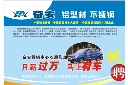福建奮安集團(tuán)成立于1988年,是一家專業(yè)生產(chǎn)鋁合金型材、不銹鋼管材、門窗幕墻配件、密封膠的大型綜合性現(xiàn)代化企業(yè),位列“中國建筑鋁型材二十強(qiáng)企業(yè)”,獲得“中國馳名商標(biāo)”“中國十大鋁型材品牌”榮譽(yù)稱號,被評為“最具創(chuàng)新與價值企業(yè)”。集團(tuán)總占地面積2000多畝,共擁有4個生產(chǎn)基地(福建福清奮安鋁業(yè)科技工業(yè)城、河南焦作奮安鋁業(yè)工業(yè)城、福建奮安不銹鋼生產(chǎn)基地、不銹鋼閩侯生產(chǎn)基地),可年產(chǎn)鋁型材30萬噸、不銹鋼管5萬噸,年產(chǎn)值可達(dá)50多億元。