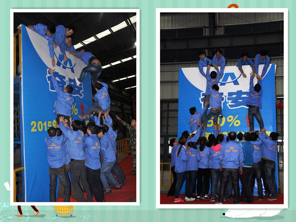 下午,各個(gè)部門、車間的“產(chǎn)銷量遞增50%以上”任務(wù)墻的挑戰(zhàn)賽更是將游園活動(dòng)推向了高潮。每個(gè)部門、車間成員團(tuán)結(jié)一心,全力合作翻越挑戰(zhàn)墻的場景不僅預(yù)示著奮安人在新的一年將信心百倍的去完成產(chǎn)銷量遞增50%以上的目標(biāo),更體現(xiàn)了奮安家人團(tuán)結(jié)一致克服困難的精神。