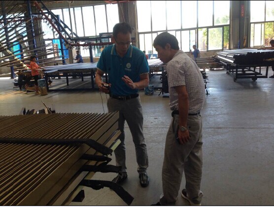 (石副總在立式噴涂車(chē)間給貴賓介紹噴涂鋁型材多樣的顏色和精細(xì)的表面)