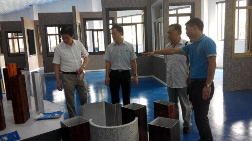 (鄒副總在全國(guó)最大的門窗體驗(yàn)中心向貴賓介紹奮安特色鋁單板、鋁模板)