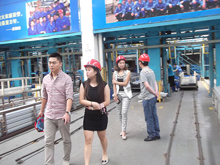 林秘書仔細地向各位貴賓介紹我司福清科技工業(yè)城的各個生產(chǎn)車間及各道生產(chǎn)工序,尤其是在噴涂和氧化車間時,貴賓對型材的表面處理工藝考察得特別仔細。林秘書介紹道,我司目前擁有四條立式噴涂線,此外,在即將竣工的二期工程,還擁有全亞洲第一條月產(chǎn)量達5000噸的立式氧化線。