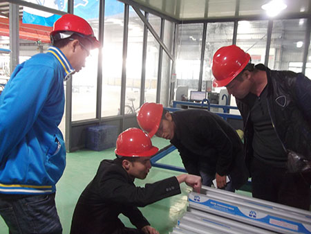 貴賓依次參觀我司型材生產(chǎn)的每一個(gè)車間,仔細(xì)考察每一道生產(chǎn)工序。尤其是在深加工車間,貴賓對(duì)注膠隔熱斷橋型材特別關(guān)注,我司型材加工成的門窗和幕墻產(chǎn)品具有良好的氣密性、防水性和隔音、節(jié)能等效果。
