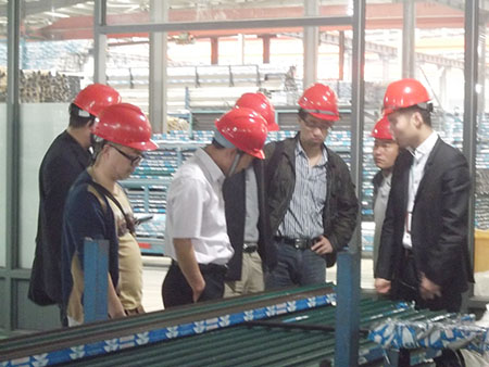 在黃總監(jiān)的引領(lǐng)下,貴賓依次參觀鋁型材生產(chǎn)的各個(gè)車間、各道工序。我司目前擁有多條立式噴涂線、立式氧化線、自動(dòng)輸送線、自動(dòng)包裝線等等先進(jìn)的設(shè)備,全程采用電腦自動(dòng)化控制。此次,貴賓特別考察我司的注膠隔熱斷橋生產(chǎn)工藝,斷橋型材具有隔熱、隔音、防水和節(jié)能等優(yōu)良性能。