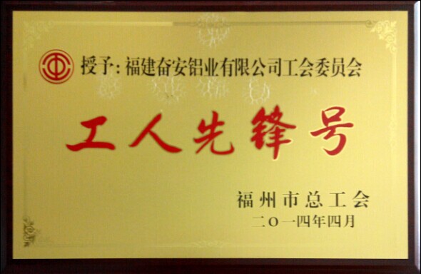 福建奮安鋁業(yè)有限公司工會委員會被福州市總工會評為2014年 “工人先鋒號”。近日,由福州市總工會評選的2014年福州市“工人先鋒號”、“五一先鋒崗”名單揭曉,我司工會作為新一批的先進集體被評選為“工人先鋒號”。