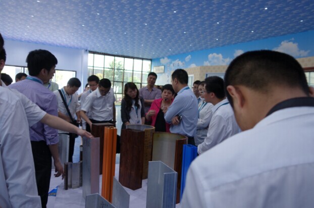 貴賓參觀奮安全國最大門窗體驗(yàn)中心,總經(jīng)理黃秀華女士詳細(xì)地向各位貴賓介紹奮安新窗型、新系統(tǒng)窗、新表面處理,如:仿古代的古鎮(zhèn)門窗、仿古欄桿、歐式系統(tǒng)門窗、現(xiàn)代窗、酒店專用窗,以及超細(xì)粉噴涂、4D木紋、電噴表面、特色鋁單板、鋁模板等一系列新表面、新產(chǎn)品。